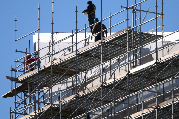 粉じん飛散や騒音の軽減のため、建物全体を覆うように 養生シート を設置します。